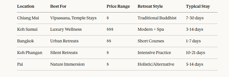 Before we dig into each location, here’s a straightforward comparison to help you narrow down your options. Different areas in Thailand attract different types of retreats, and matching your goals with the right region will save you time and frustration.